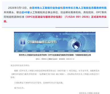 2026年3月12日,由苏州市人工智能行业协会和苏州市长三角人工智能生态服务研究院共同牵头,联合近40家人工智能相关企事业单位、创业孵化载体机构、高校院所、OPC等共同制定的团体标准《OPC社区建设与服务评价指南》(T/SZAI 001-2026)正式发布并实施。