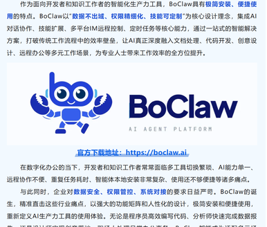 苏州市人工智能行业协会副会长单位博云科技正式发布了AI原生智能体平台BoClaw。作为面向开发者和知识工作者的智能化生产力工具,BoClaw具有极简安装、便捷使用的特点。BoClaw以“数据不出域、权限精细化、技能可定制”为核心设计理念,集成AI对话协作、技能扩展、多平台IM远程控制、定时任务等核心能力,通过一站式的智能解决方案,打破传统工作流程中的效率壁垒,让AI真正深度融入文档处理、代码开发、创意设计、远程办公等多元工作场景,为专业人士带来工作效率的全方位提升。