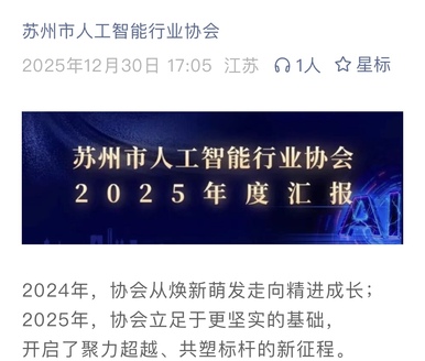 2025年,苏州市人工智能行业协会在市工信局和各相关部门的支持指导下,通过全体会员单位的共同努力,持续做实场景对接、做深产业研究、做细企业服务,为苏州人工智能产业高质量发展践行使命、贡献力量。