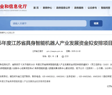 根据省工业和信息化厅、省财政厅《关于组织2025 年度江苏省具身智能机器人产业发展资金项目申报的通知》(苏工信综合〔2025〕287号),经规定程序,拟支持3个具身智能机器人创新中心培育项目和4个具身智能机器人数据采集训练中心建设项目。
